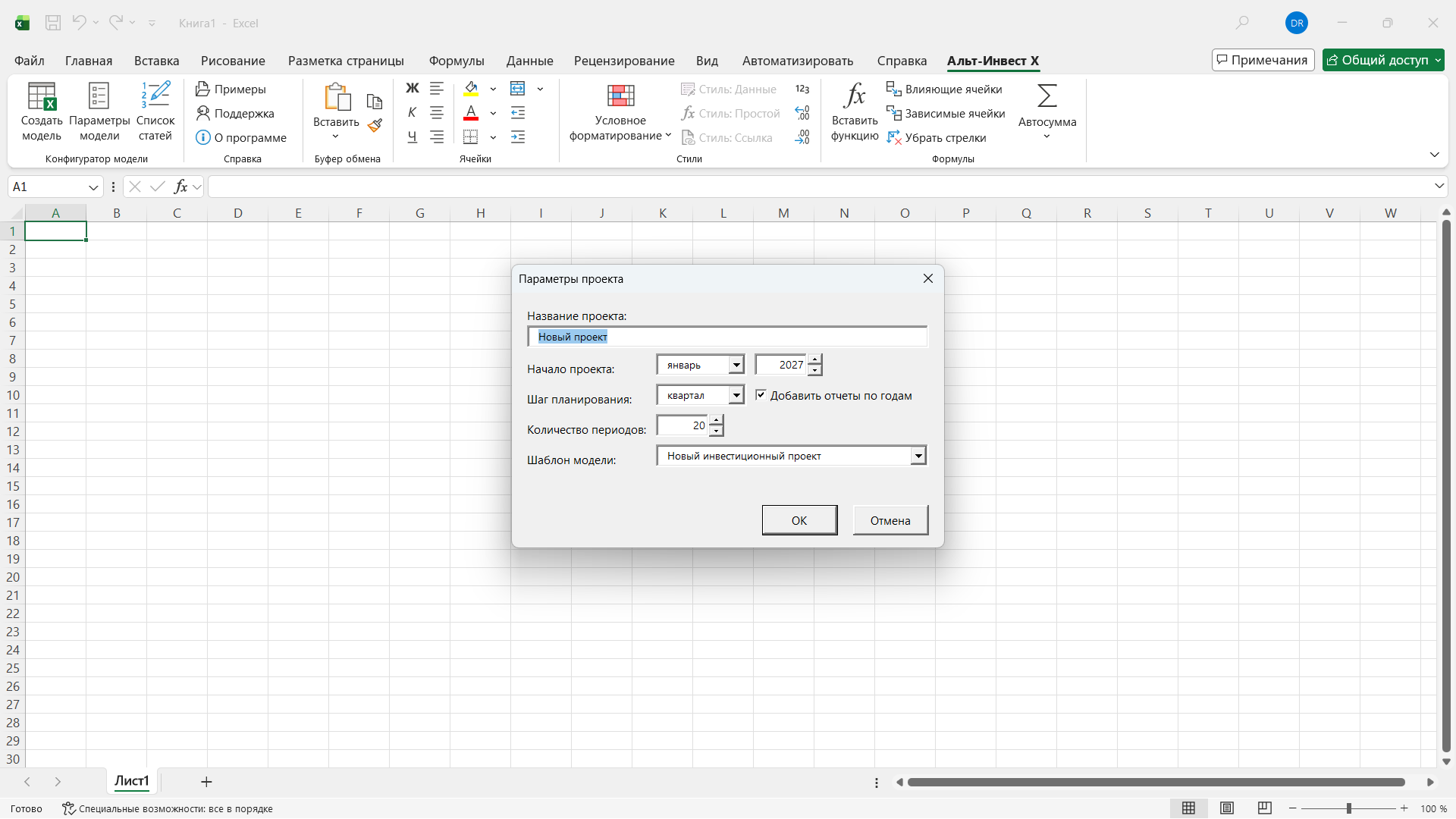 Откройте вкладку Alt-Invest X в Excel, нажмите «Создать модель» и выберите шаблон, подходящий под ваши задачи.